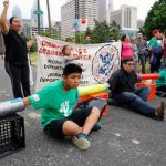 The protesters linked themselves together and temporarily blocked the I-676 off ramp to Broad Street, causing a major traffic jam.